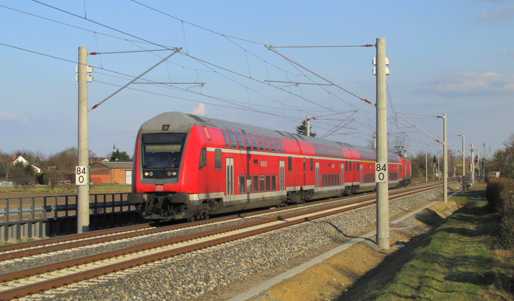 Auf diesem Bild ist der RE2 von Cottbus nach Wismar zu sehen. Er fuhr am 23.03.2012 in umgekehrter Reihenfolge. Hinten schon eine Lok der Baureihe 112.