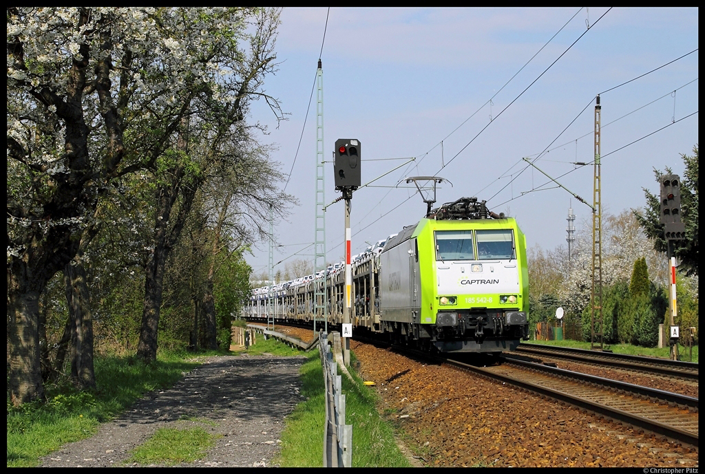 185 350-6 brettert am 20.04.2012 mit einem langen Güterzug durch den Bahnhof von Dreieich-Buchschlag.