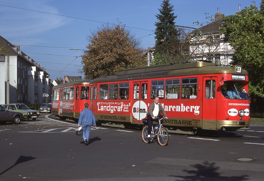 Bonn Tw 209 mit Bw 289 am Hindenburgplatz im Verluf der Hausdorffstraße, 22.10.1988.