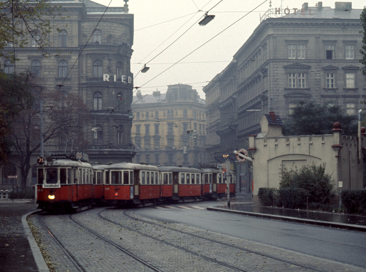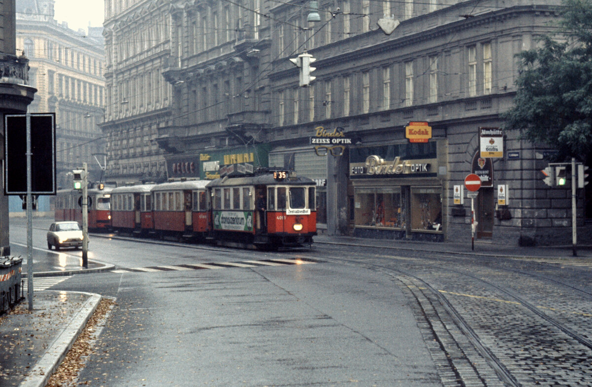 Wien Wiener Stadtwerke-Verkehrsbetriebe (WVB) Allerheiligen-Verkehr am 1. November 1975: SL 35 (M 4064 + m2 5229 + m) I, Innere Stadt, Kärntner Ring / Schwarzenbergplatz. - Hersteller des M 4064 und des m2 5229: Simmeringer Waggonfabrik. Baujahr: 1928. - Scan eines Diapositivs. Kamera: Minolta SRT-101.