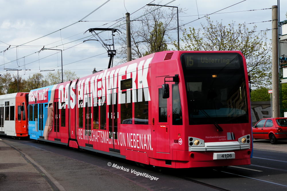 Niederflurwagen 4106 trägt eine neue Ganzreklame für "Das Handwerk". Unterwegs auf der Neusser Straße am 23.04.2012