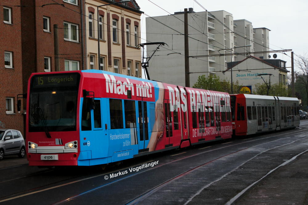 Niederflurwagen 4106 trägt eine neue Ganzreklame für  Das Handwerk . Unterwegs auf der Neusser Straße am 23.04.2012
