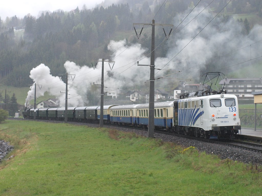 ÖBB 2016 009 am Bahnhof Puchberg am Schneeberg mit dem Sonderzug des MÁV-Nosztaliga aus Budapest, am 14. 05. 2011.