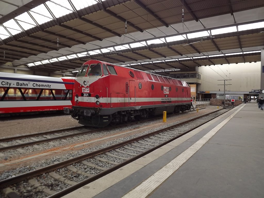 MEG 301 (229 120) hat am 24.04.2012 schon Feierabend während 346 001 der PRESS noch ihre Schotterwagen über den Chemnitzer HBF schiebt.