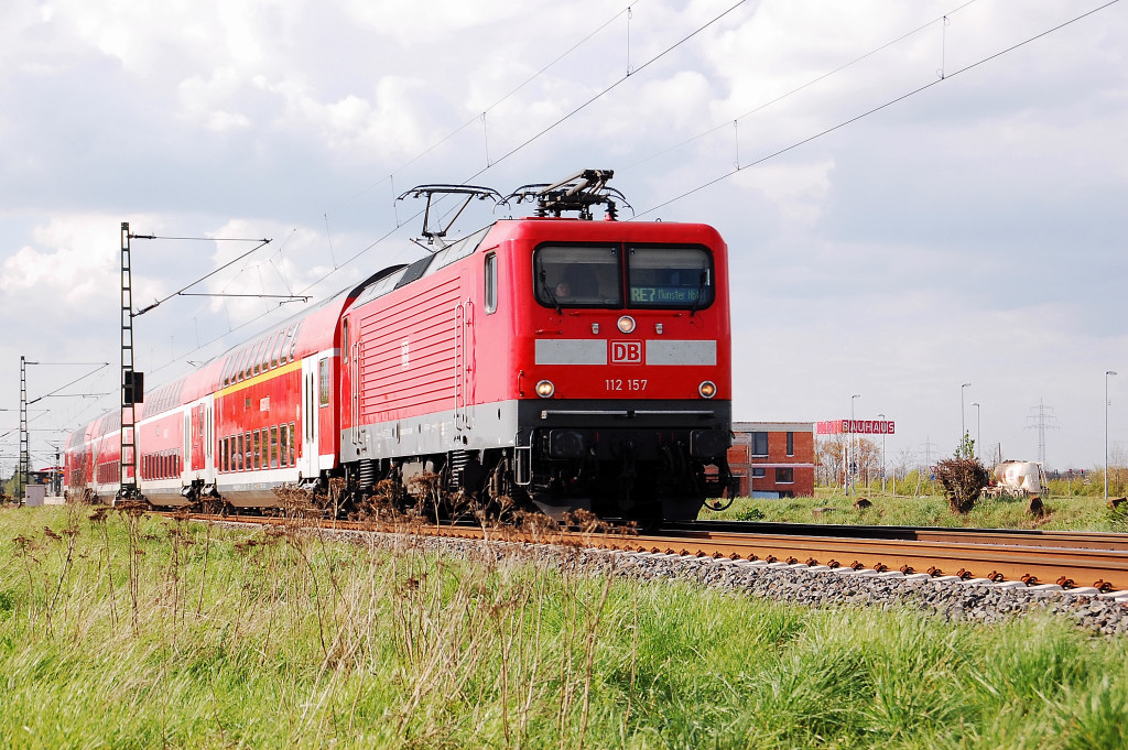 Mit der für die Kbs 495 typischen Dostockfuhre als RE7 nach Rheine, kommt die 112 157 auch am 20. April 2012 wieder kurz hinterm Hp Allerheiligen vorbei gerauscht....