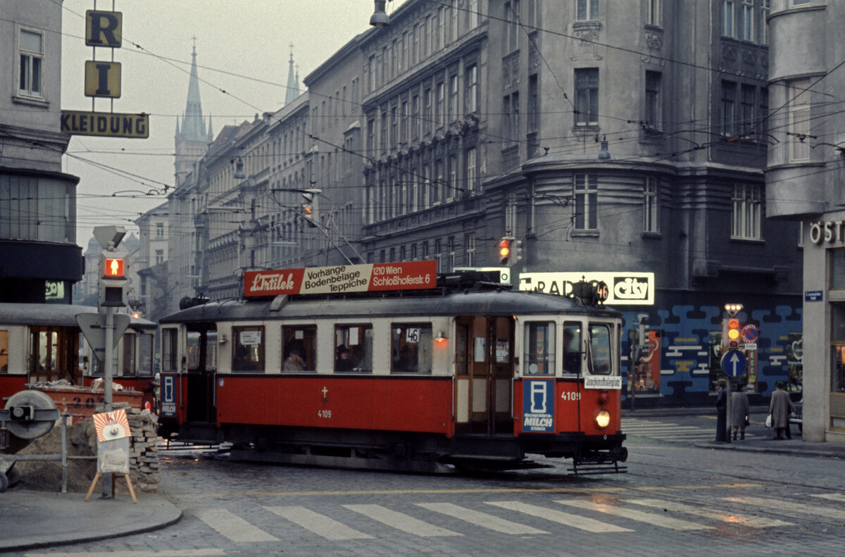 Wien Wiener Stadtwerke-Verkehrsbetriebe (WVB) Allerheiligen-Verkehr am 1. November 1975: Der M 4109 (Lohnerwerke 1929) als Linie 46Z biegt von der Blindengasse in die Lerchenfelder Straße ein. - Die Friedhofslinie 46Z (Z = Zentralfriedhof) benutzte in Richtung Zentralfriedhof die Stammstrecke 46 bis zum Ring, während die Linie in Richtung Joachimstahlerplatz vom Ring über Stadiongasse, Josefstädter Straße und Blindengasse bis Lerchenfelder Straße / Lerchenfelder Gürtel fuhr. - Scan eines Diapositivs. Kamera: Minolta SRT-101.