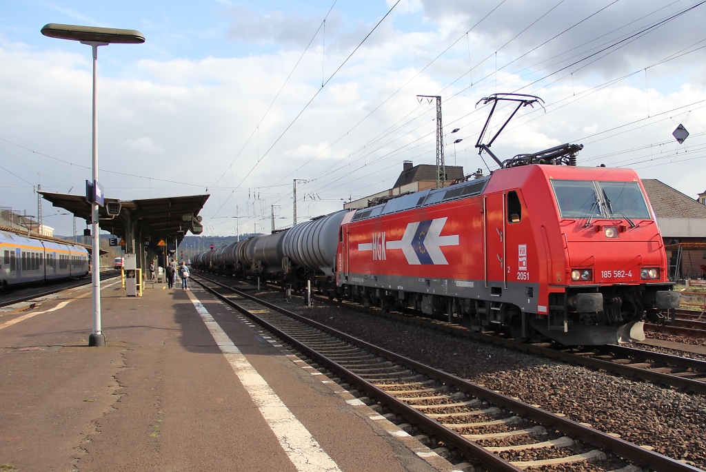 185 582-4 passiert mit ihrem Kesselwagenzug Bebra. Aufgenommen am 07.04.2012.