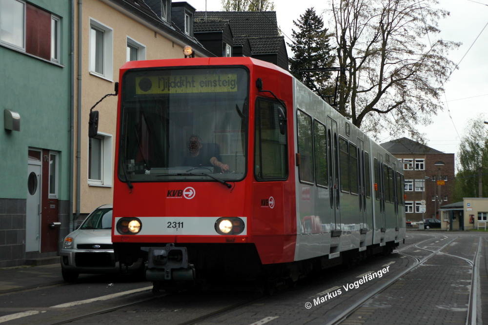B-Wagen 2311 hat eine Neulackierung erhalten und hat gerade die Hauptwerkstatt Weidenpesch (im Hintergrund) am 25.04.2012 verlassen.