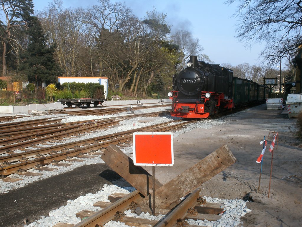 Gut zwei Minuten später nach der Ankunft verließ 99 1782,am 21.April 2012,Baabe in Richtung Putbus.