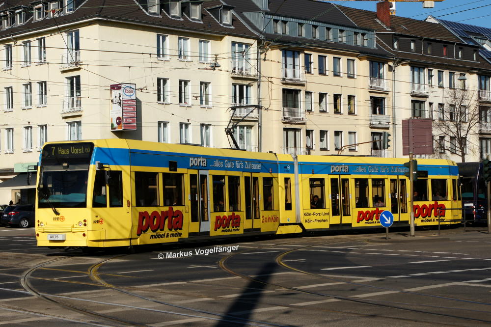 Niederflurwagen 4035 mit der Ganzreklame "Porta Möbel" auf der Kreuzung Aachener Str./Gürtel am 19.03.2012