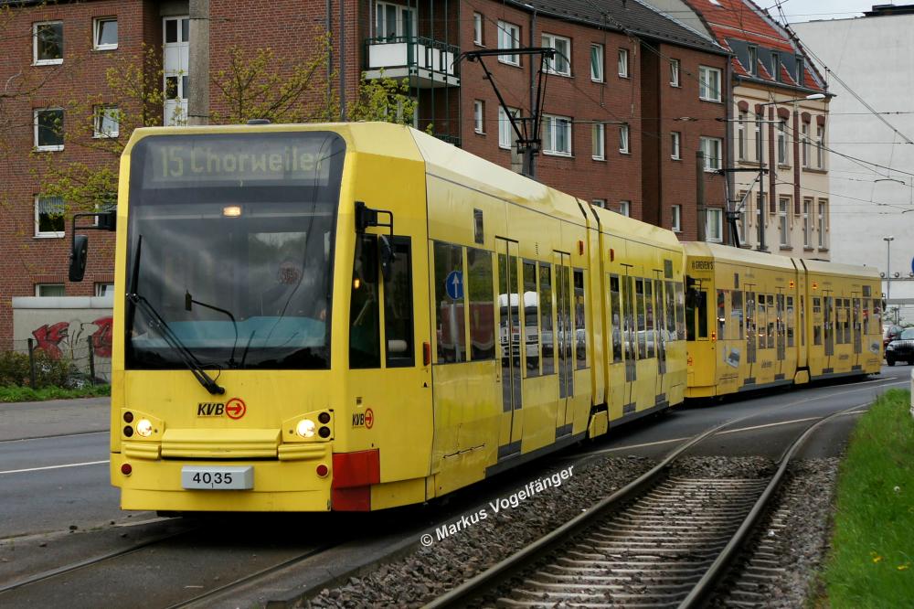 Niederflurwagen 4035 wurde die Ganzreklame "Porta Möbel" entfernt. Er fährt nun in gelber Grundlackierung durch die Stadt. Unterwegs auf der Neusser Straße am 25.04.2012