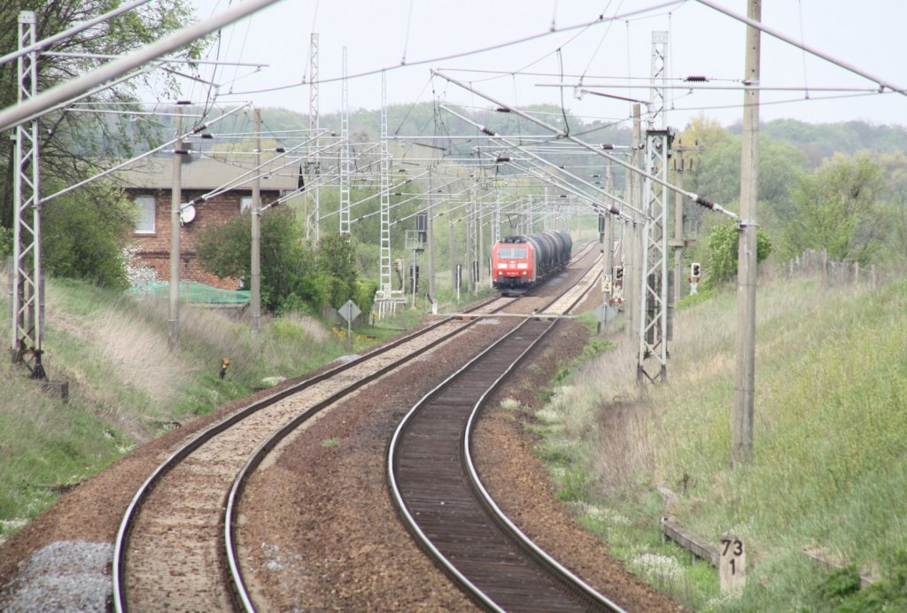 29.4.12 Berlin - Stettiner Bahn bei Angermünde. Ein Kesselzug von Stendell kommend passiert den BÜ bei Kerkow. Hinter dem bewohnten ehem. Beamtenwohnhaus stand das abgerissene Stw "Abzweig Kerkow".