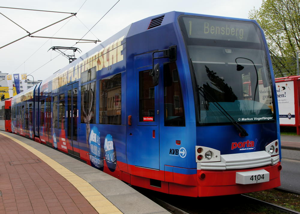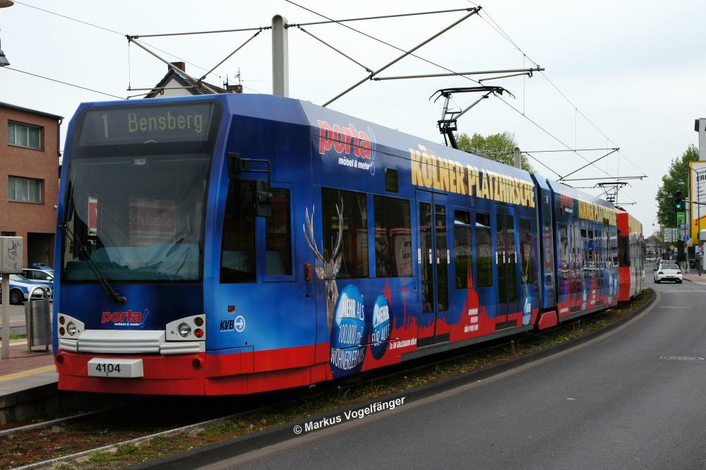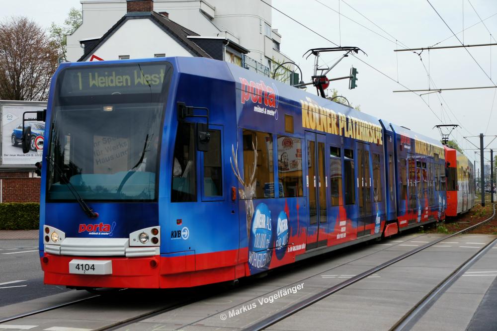 Niederflurwagen 4104 auf der Kreuzung Aachener Straße/Frechener Weg im Stadtteil Weiden am 29.04.2012. Er hat eine neue Ganzreklame für "Porta Möbel" erhalten.
