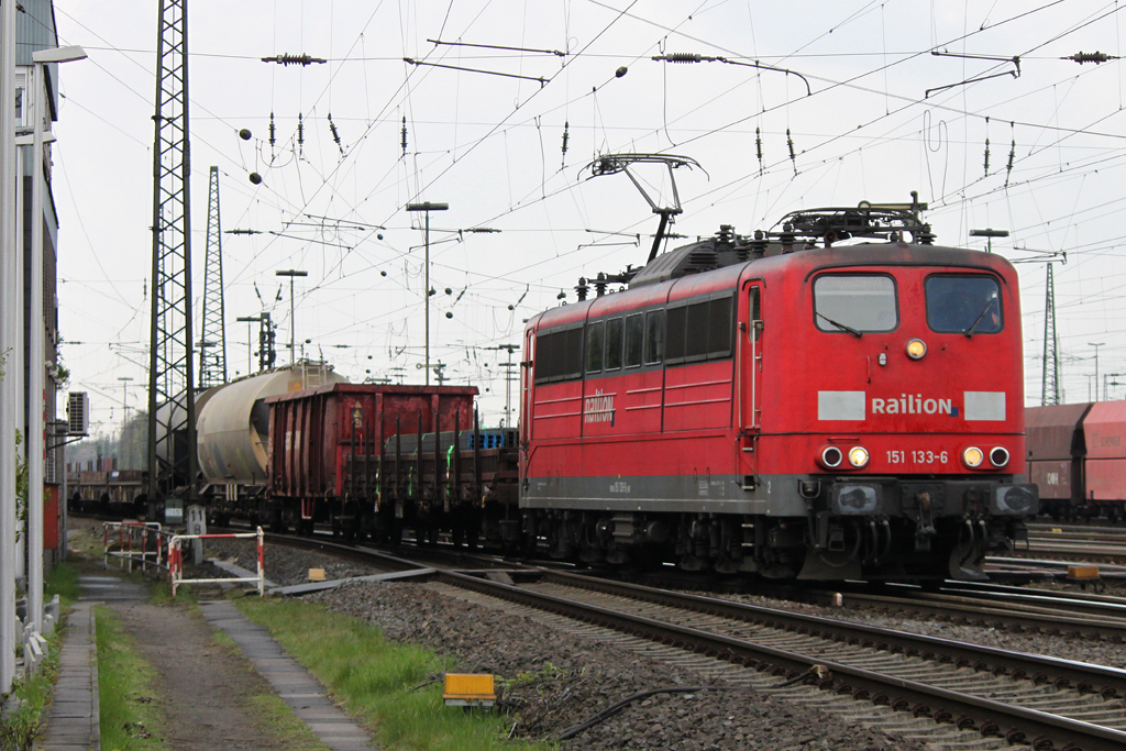 151 018-9 zieht am 29.04.2012 einen leeren Kohlenzug aus Richtung Köln kommend durch die letzte Kurve vor Aachen West.