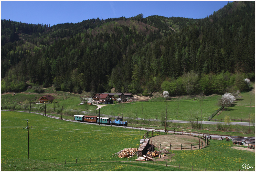 Anlässlich der Ausstellungseröffnung „175 Jahre Eisenbahn in Österreich“ in Mixnitz, gab es am 28.4.2012 zwei Sonderzüge mit der Lok E3 auf der Breitenauerbahn.