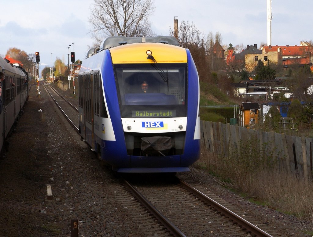 Dieser LINT 27-Triebwagen des "Harz-Elbe-Express" aus Blankenburg kommend, verursachte am 07.04.2012 einen kurzen "Zwangsaufenthalt" auf dem Ausweichgleis für 18 201 mit ihrem Sonderzug aus Leipzig (links im Bild)! Nachdem er passiert hatte, konnten wir die Fahrt fortsetzen.