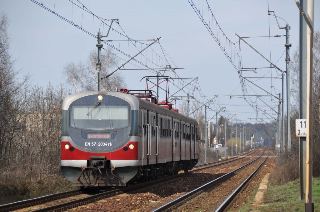 EN57 2034 mit einer Regionalbahn nach Tychy-(Miasto) bei Katowice Podlesie (11.04.2012)
