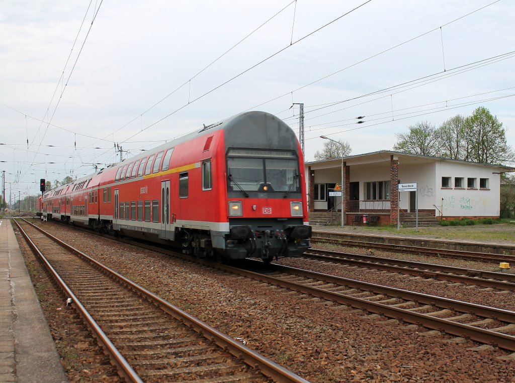 Hier ein RE7 (RE18255) von Wünsdorf-Waldstadt nach Berlin Zoologischer Garten, bei der Einfahrt am 30.4.2012 in Berlin Schönefeld Flughafen.