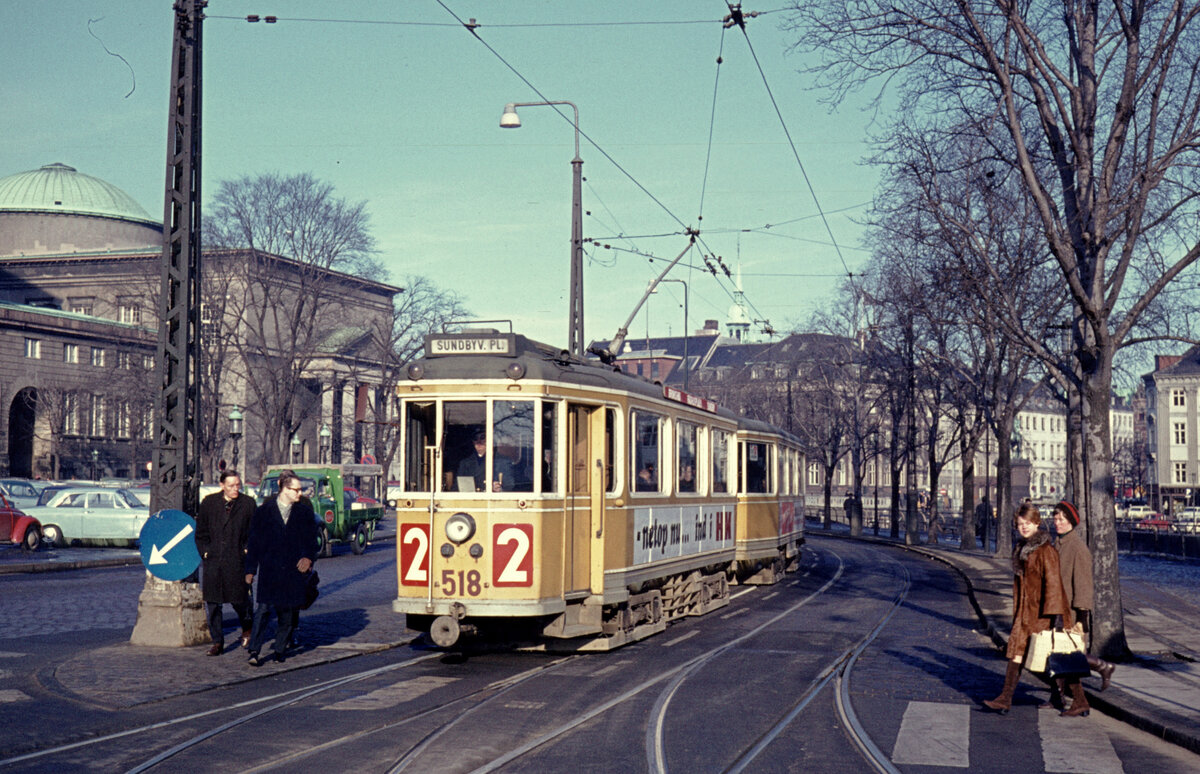 København / Kopenhagen Københavns Sporveje (KS) SL 2 (Großraumtriebwagen 518) København, Slotsholmen, Christiansborg Slotsplads / Holmens Bro im März 1969. - Links befindet sich Christiansborg Slot (: Schloss), wo das dänische Folketing, d.h. Parlament, seinen Sitz hat. Im Hintergrund sieht man auf der linken Seite die Schlosskirche (Christiansborg Slotskirke), die vom dänischen Architekten C.F. Hansen in den Jahren 1813-26 im klassizistischen Stil errichtet wurde, und auf der rechten Seite (teilweise hinter den Bäumen) die Statue vom Bischof Absalon, dem Gründer der Stadt Kopenhagen im Jahre 1167. Die Statue steht auf dem Højbro Plads (Højbro: Hohe Brücke). - Das dänische Wort 'holm' bedeutet 'Werder'. - Scan eines Diapositivs.