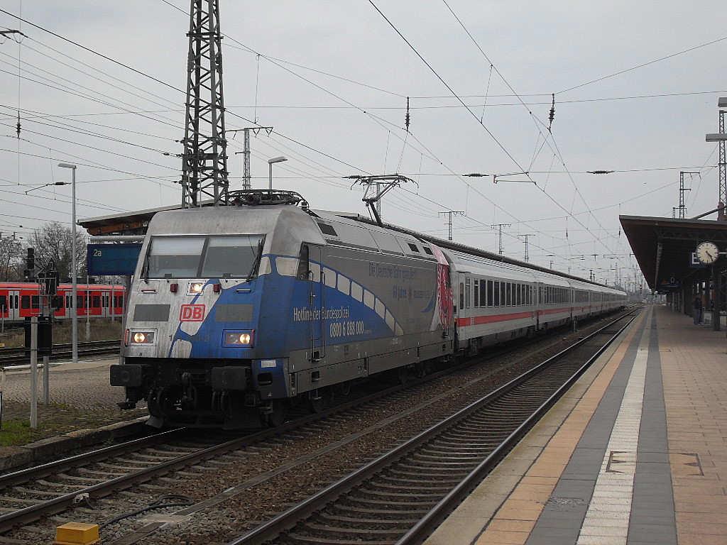 101 039 fuhr am 06.04.2012 mit dem IC 2239 WARNOW in Stendal ein.