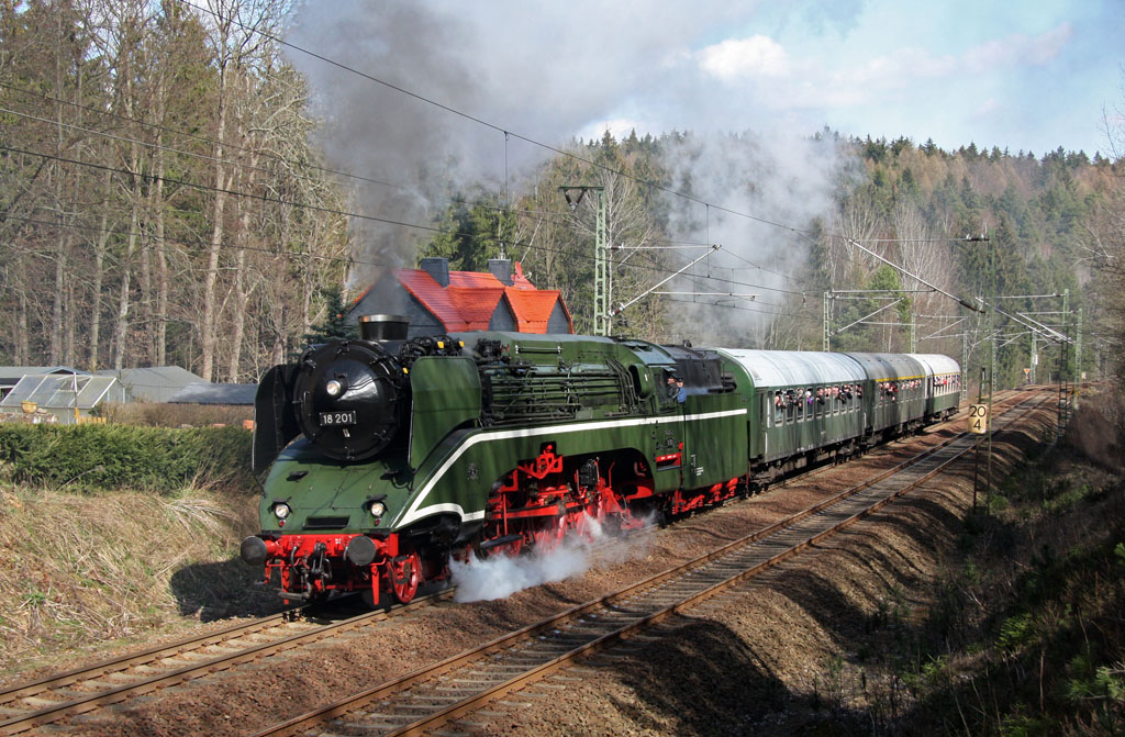 01.04.2012, 18 201 auf der Tharandter Rampe in Höhe Seerenteich - Parallelfahrt mit 03 1010 diesmal bei herrlichem Sonnenschein; allerdings habe ich die falsche Stelle gewählt, denn die 03 kommt ein wenig später