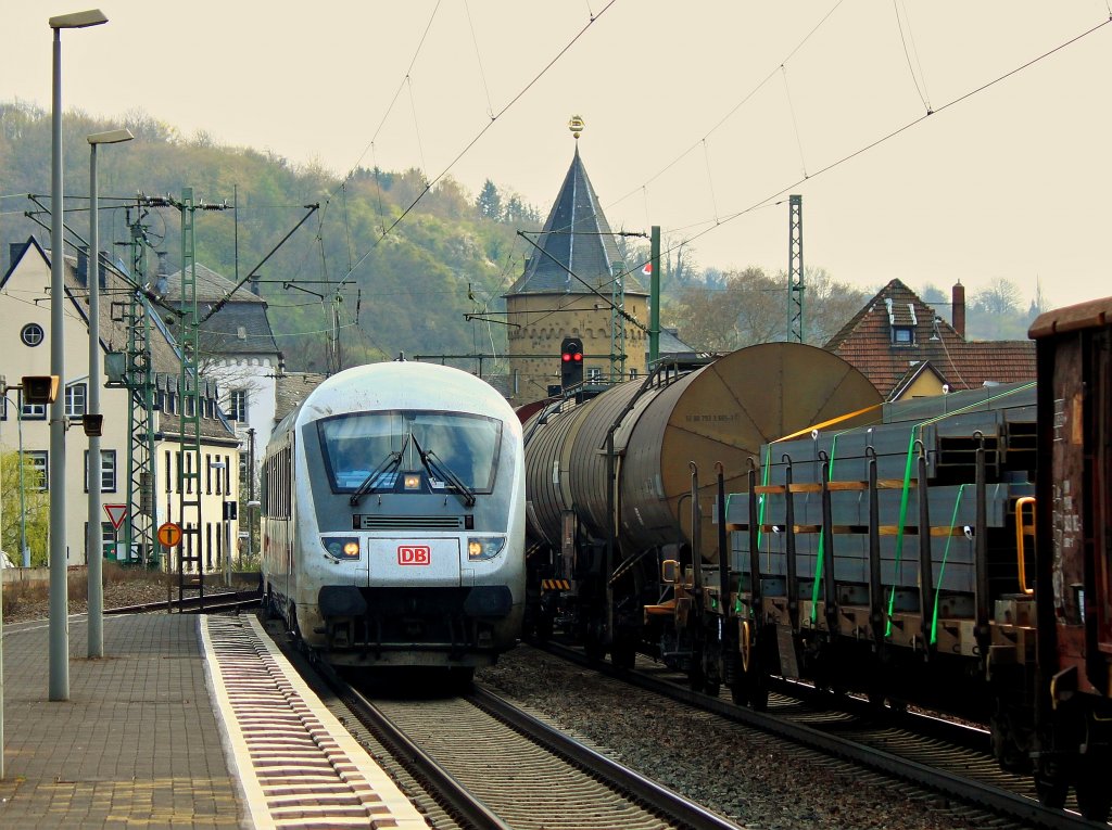Begegnung am 03.04.2012 eines IC Umleiter mit einem Güterzug in Linz am Rhein