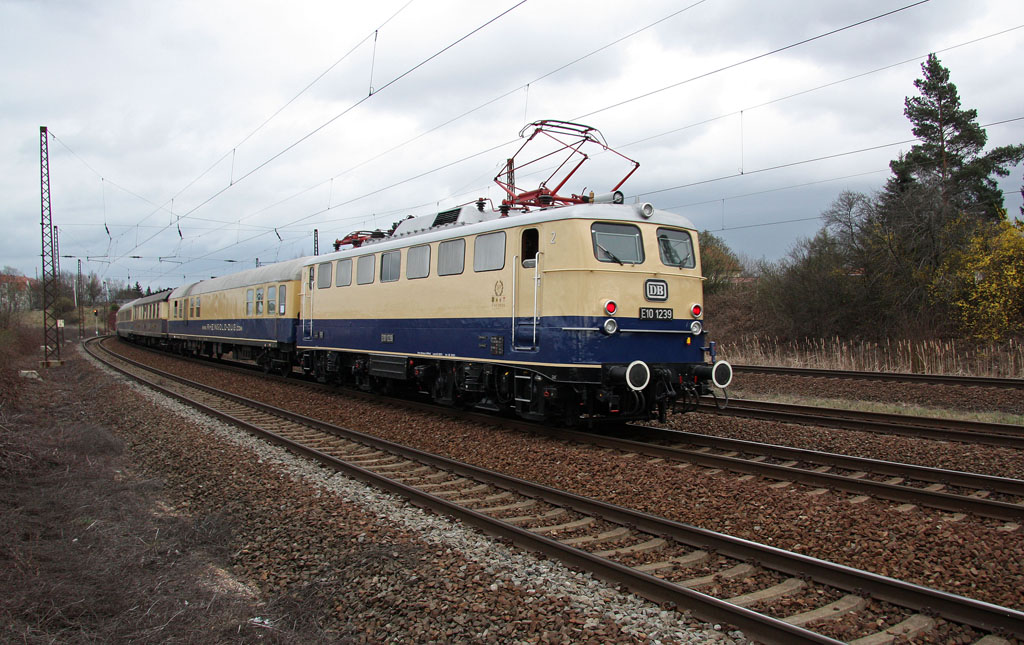 Dieser Nachschuß zeigt E10 1239 als Schlußlok des "Semper-Nostalgie-Express" am 29.03.2012 auf der Fahrt von Köln nach Dresden in Leipzig-Wiederitzsch.