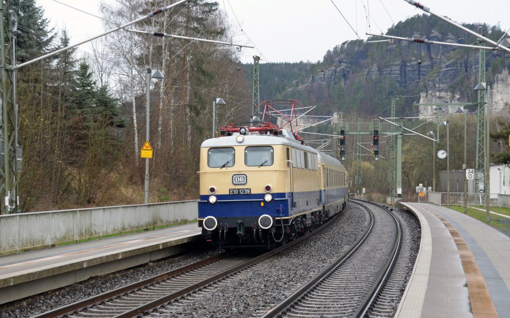 E 10 1239 durcheilt mit dem Sonderzug von Dresden nach Bad Schandau am 31.03.12 den Haltepunkt Rathen.