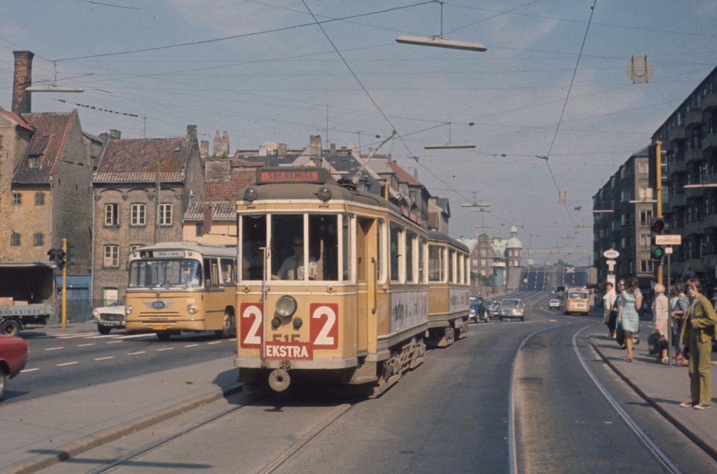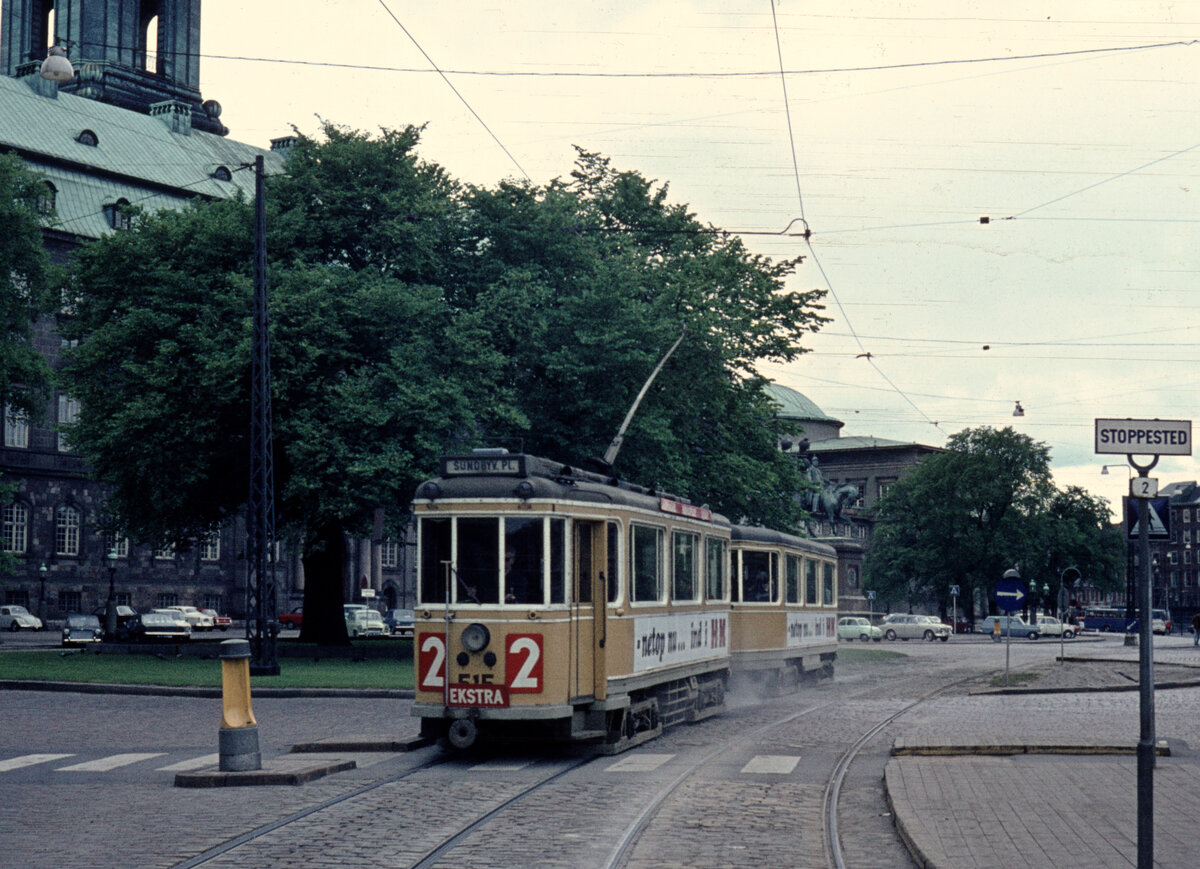 København / Kopenhagen Københavns Sporveje (KS) SL 2 (Tw 515) København K, Slotsholemn, Holmens Bro im Juni 1969. - Der Großraumtriebwagen 515 fuhr als täglicher E-Wagen auf der Linie 2 morgens in der HVZ im Sommer 1969. - Auf der linken Seite lässt sich ein Teil vom Schloss Christiansborg sehen. - Scan eines Diapositivs.