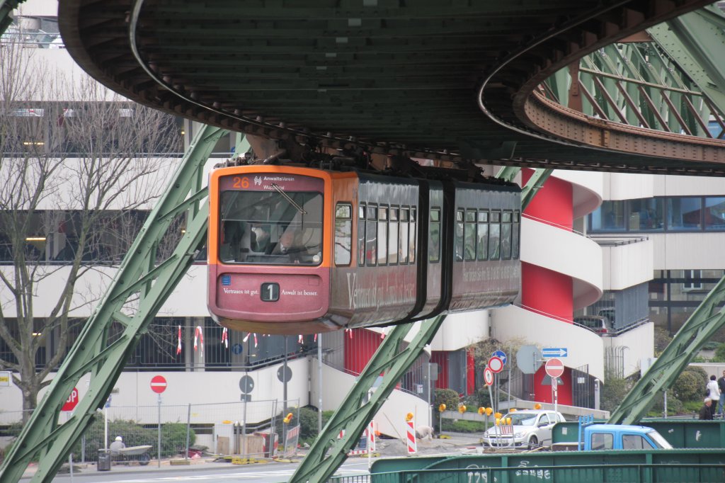 Wagen 26 schwebt am 01.04.2012 Richtung Oberbarmen in den Hp Hauptbahnhof ein.