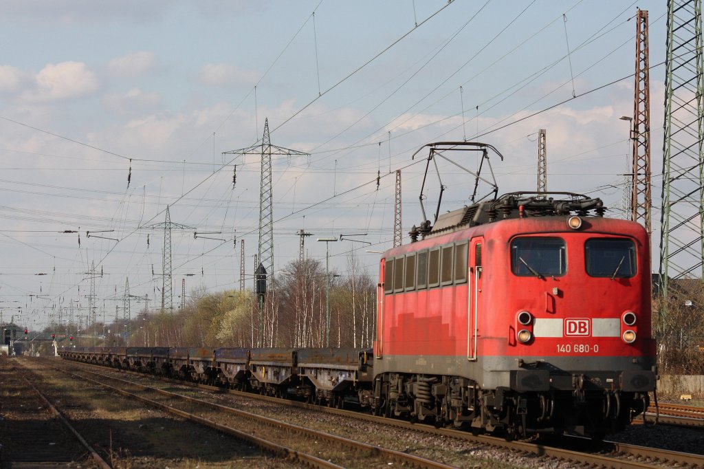 140 680 am 19.3.12 mit einem Flachwagenzug bei der Durchfahrt durch Ratingen-Lintorf.