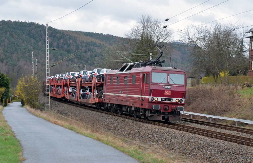 185 222-7 mit einem Toyota Autozug in Richtung Neuss kurz vorm HP Allerheiligen am 7.4.2012