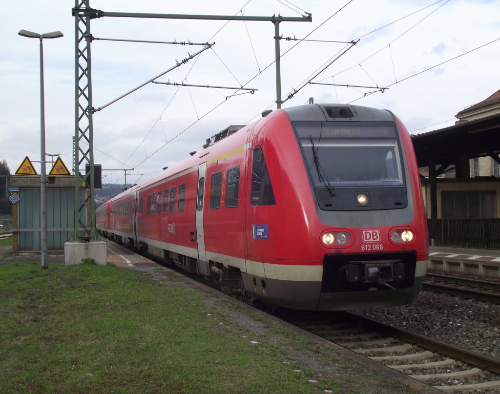 612 066 und ein weiterer 612er stehen am 2. April 2012 als RB nach Bamberg auf Gleis 4 in Kronach.
