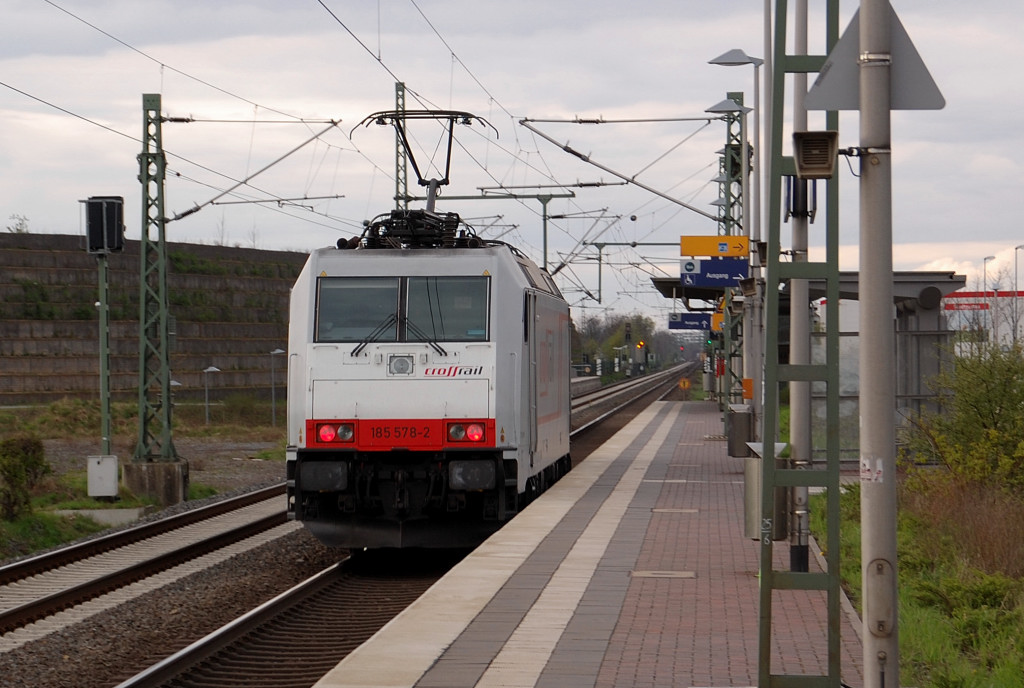 Leider nur als Nachschuß die Crossrail 185 578-2 Lz am Bahnsteig entlang in Allerheiligen gen Neuss unterwegs.......7.4.2012