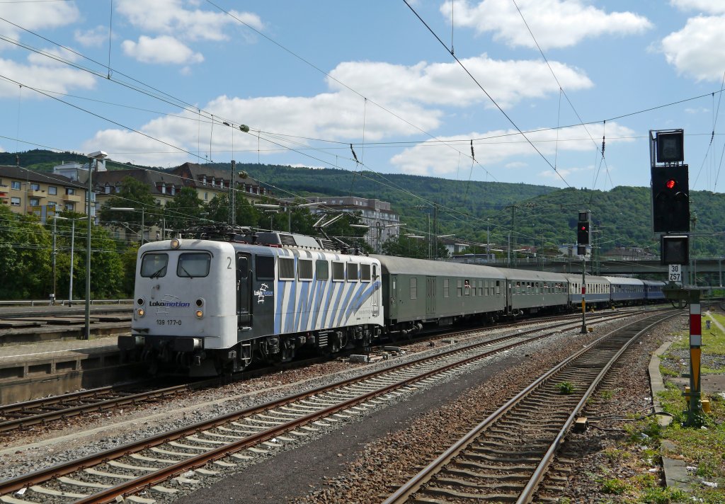 139 177 der Lokomotion zieht den Sonderzug Sdz 92759 (als Ersatz für 01 1066) nach Koblenz, wo am Abend das Festival "Rhein in Flammen" mit großem Feuerwerk stattfindet. (Heidelberg Hbf, 11.08.12)