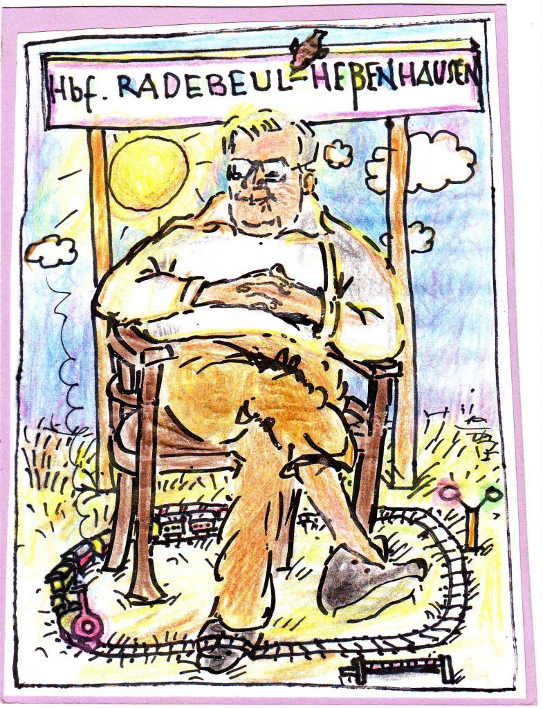 Eine kleine "Eisenbahnkarrikatur" Abgebildet ist der nunmehr über achtzigjährige