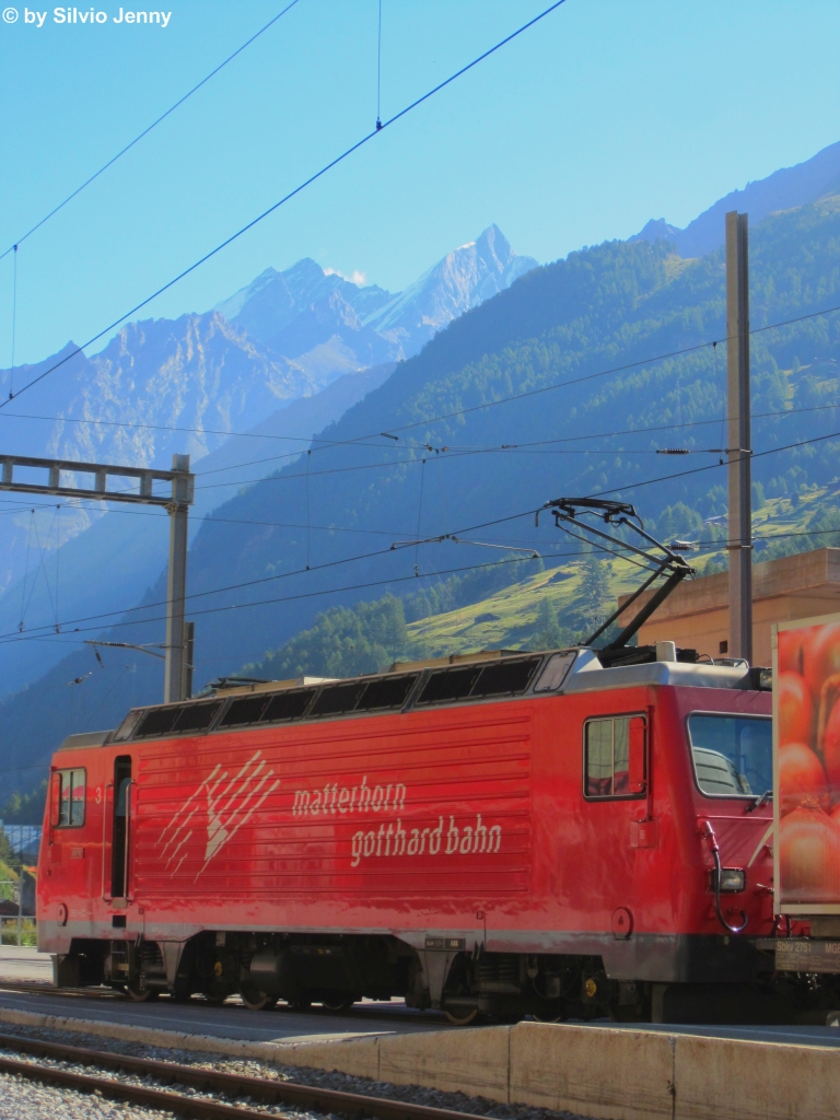 Die HGe 4/4'' 1 ''Matterhorn'' am 2.8.2012 oberhalb Täsch mit dem Regio 249 kurz vor dem Ziel Zermatt.