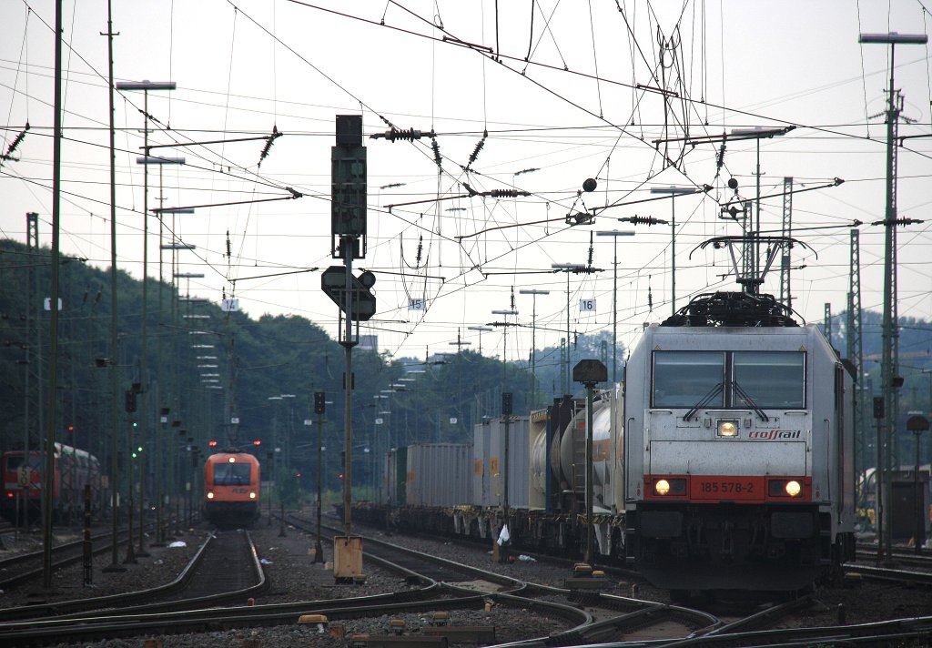 LTE 185 529 "Michaela" und eine S6 bei der Durchfahrt durch Düsseldorf-Rath.