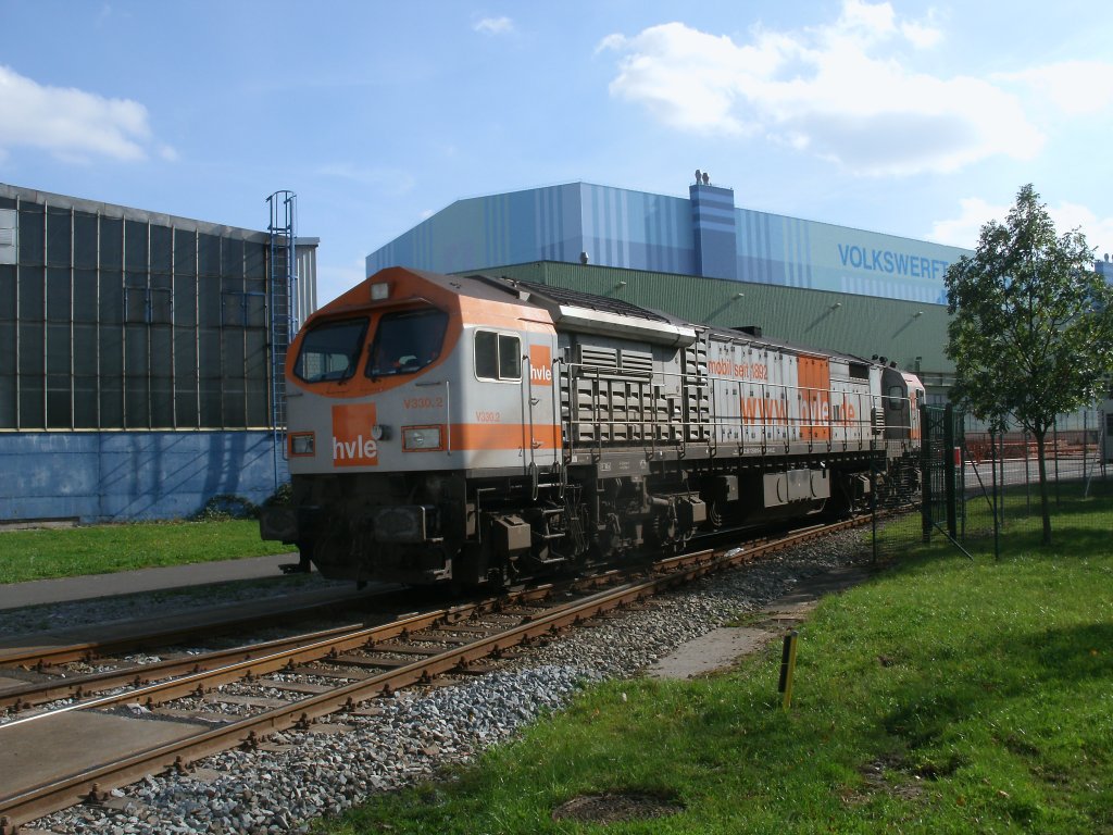 Am 24.September 2011 war der hvle Tiger V330.2 auf dem Zufahrtsgleis zum Stralsunder Südhafen unterwegs.