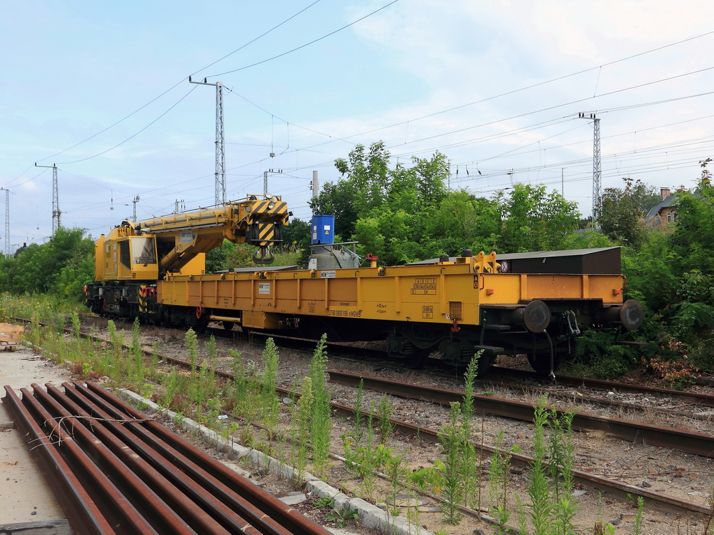 Schutzwagen (37 80 3900 199-5 MGWB) und  Gleisbauschienenkran KRC 810 T (97 82 53 507 19-5)  der Gleisbaufirma MGW GmbH, 10243 Berlin  steht am 10. August 2012 im Güterbahnhof Grünau.