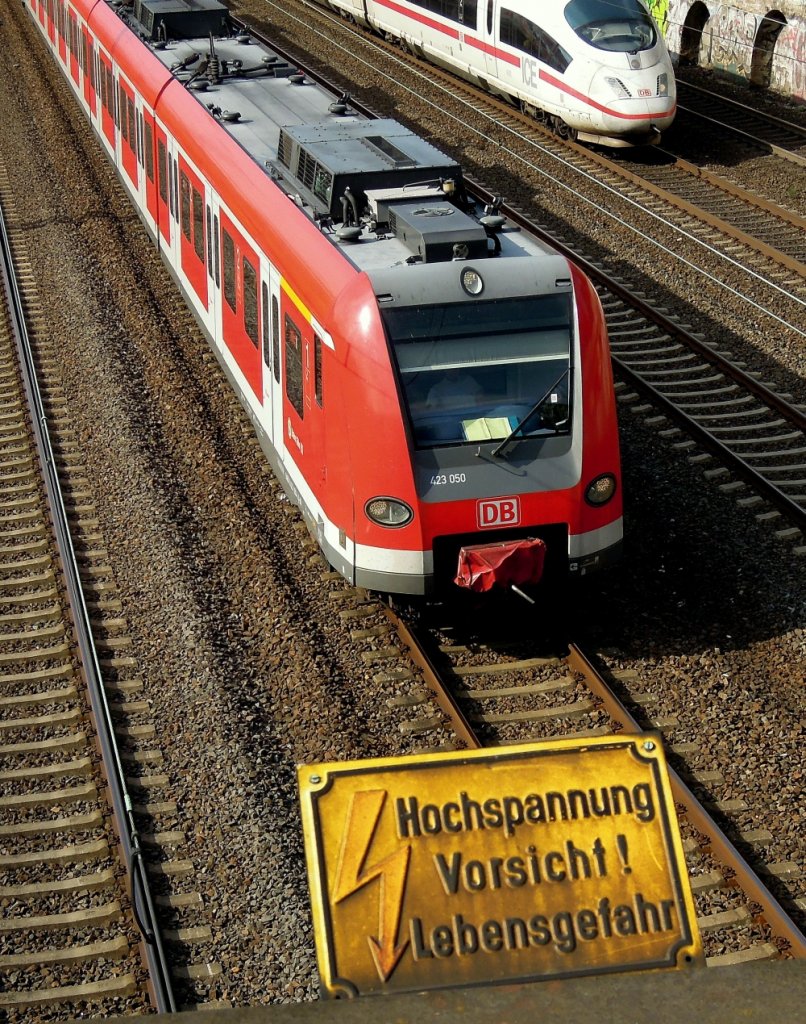 Hochspannung: Blick von der Grunerstraßen-Brücke in Düsseldorf-Derendorf. 15.8.2012