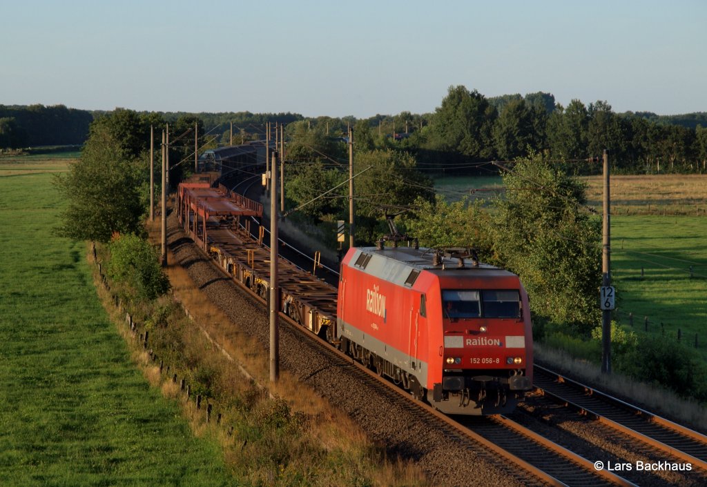 152 056-8 hat am 1.08.12 einen leeren, gemischten Güterzug am Haken und passiert Ramelsoh.