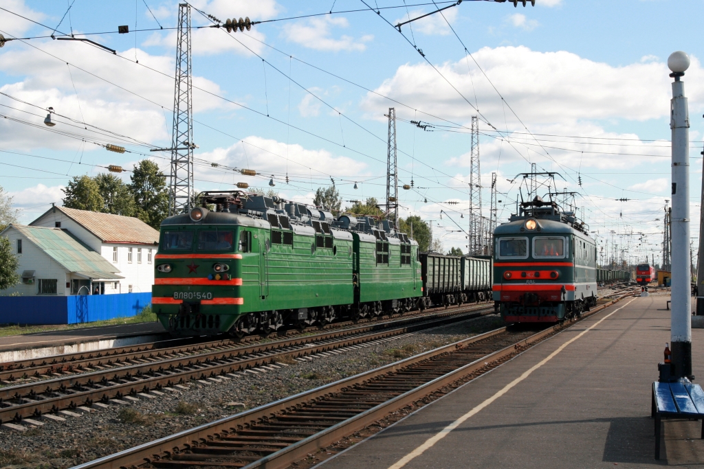 ВЛ80(WL80)-540 vor einem Kohlenzug überholt ЧС2(TschS2)-684 als Verschubfahrt im Bahnhof Balezino. 29.07.2012