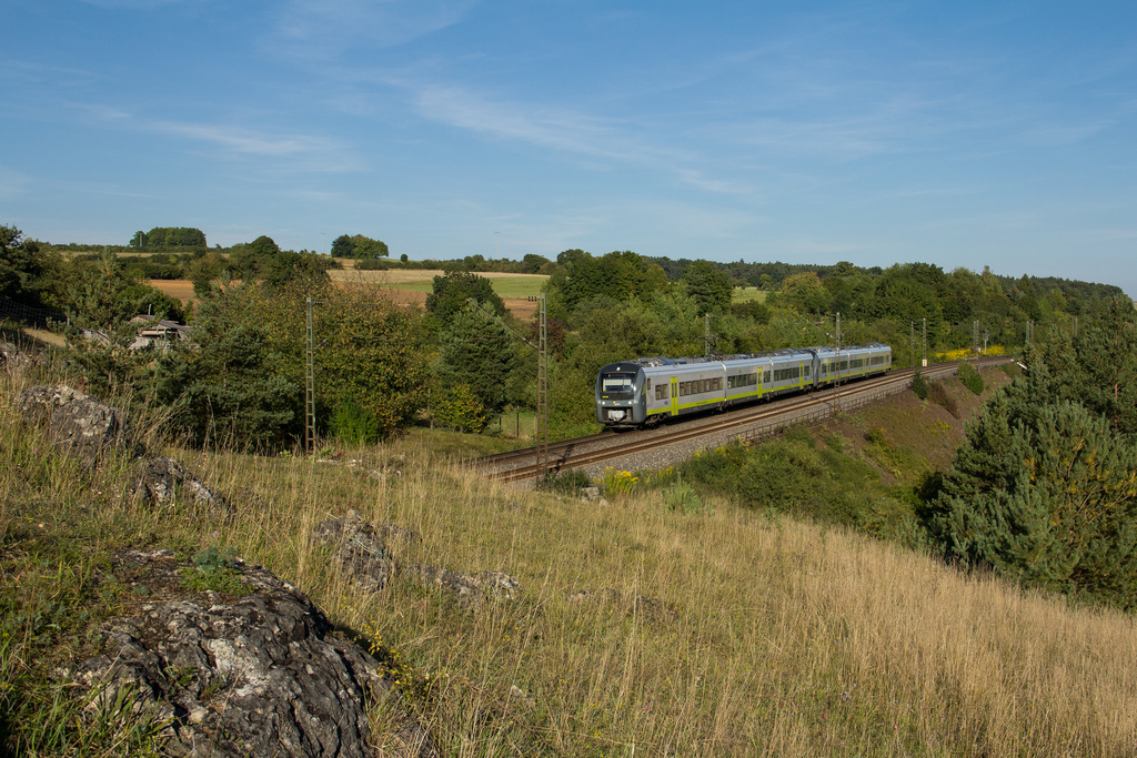 Auf der idyllischen Orlabahn nähert sich dieser Desiro, der hier bereits als Ersatzfahrzeug im Auftrag der Erfurter Bahn unterwegs ist, als EB Jena - Pößneck seinem Zielbahnhof - ein (später) Gruß zurück an den Tf! (30.06.2012)