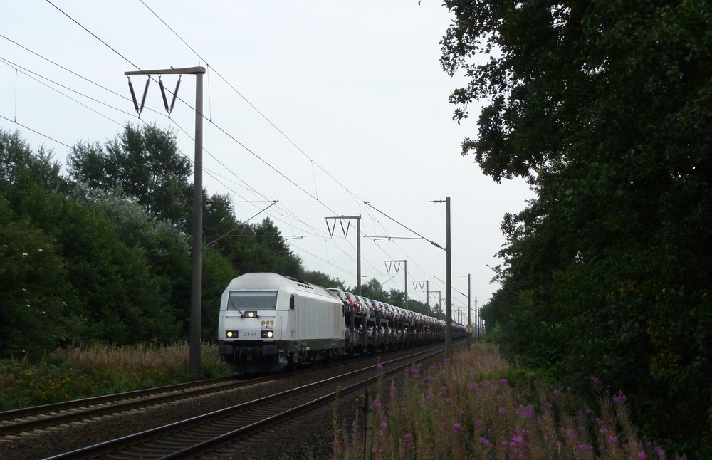 223 154 fuhr am 21.08.2012 mit einem Autozug aus dem Osten nach Emden, hier bei Neermoor.