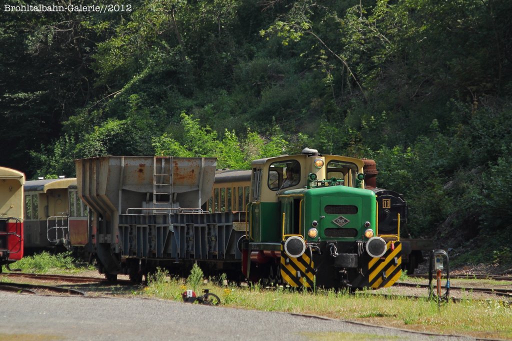 Am 15. August 2012 fand im Brohltal ein reger Güterbetrieb statt. BEG D1 mit den Wagen 451, 452 und 512 am Nachmittag im Bahnhof von Brohl.