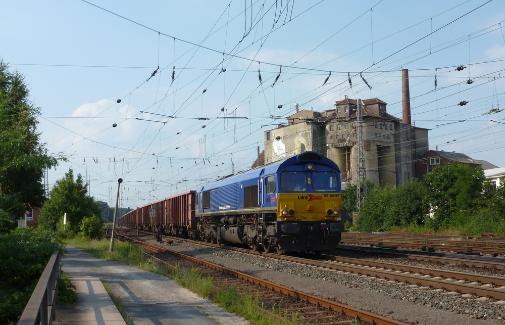 Eine Class 66 von LWB fuhr am 25.07.2012 mit einem Güterzug durch Verden.