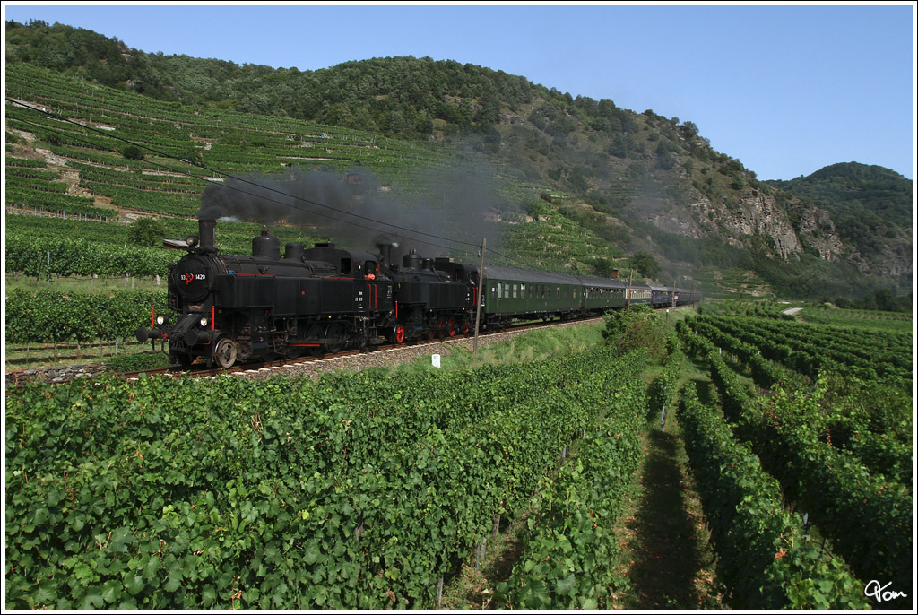 IGE-Eisenbahn Romantik Österreich Rundfahrt am 22.8.2012 von Wien über Siegmundsherberg nach Aggsbach Markt und wieder retour nach Wien, ab Siegmundsherberg bis Aggsbach Markt und retour bis Dürnstein Oberloiben mit 93.1420 und 93.1421 bespannt, aufgenommen in Unterloiben in der Wachau. (EK Schild entfernt)