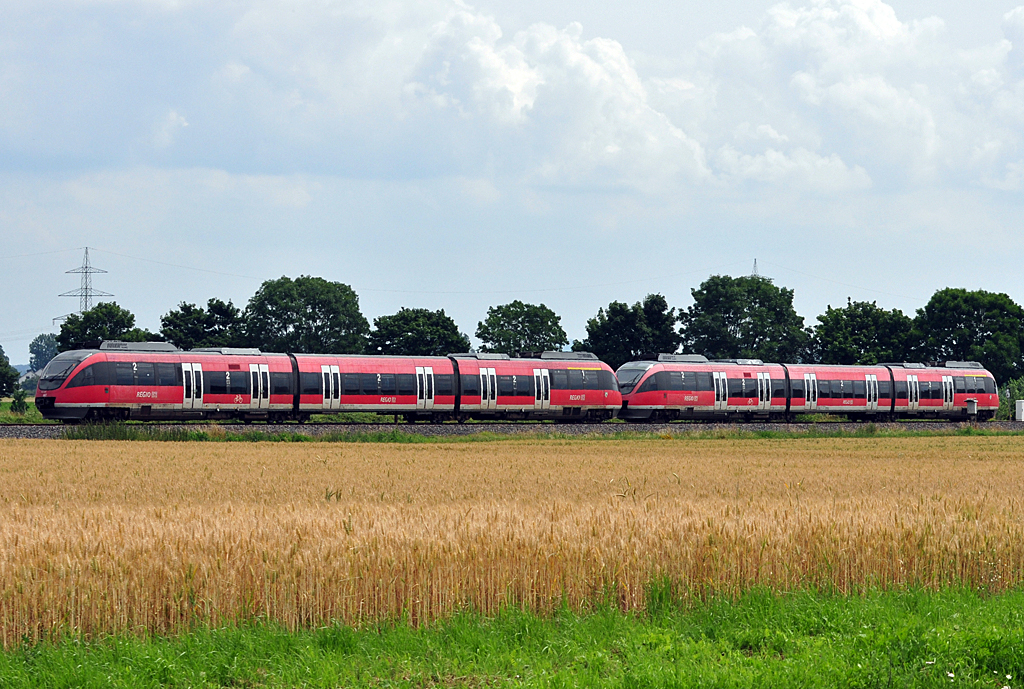 Ersatz RE1 Paderborn- Aachen als doppelter 425 statt der 6 Dostos mit 146. Hier auf Begegnung mit der ebenfalls doppelten Eurobahn nach nach Kassel Wilhelmshöhe. Hier am Sontag Abend des 12.8.2012.