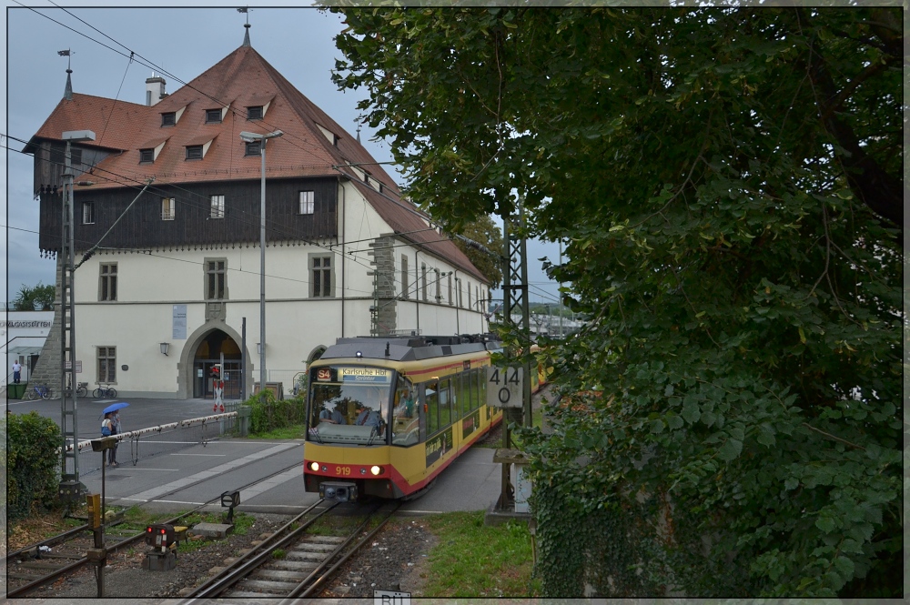 Die Karlsruher Straßenbahn als S4 Karslsruhe Hauptbahnhof Sprinter bei der Ausfahrt aus Konstanz mit Historischer Kulisse. August 2012.